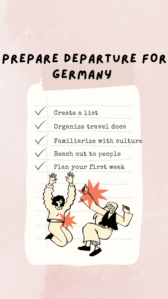 What should you DO?: Outline what your first week will look like. Plan how you’ll get from the airport to your new home, the time frame for setting up your bank account, registering with the local authorities (a must in Germany!), and even exploring your neighborhood. Perhaps, list some places to visit, like nearby parks, cafes, and grocery stores, to get acclimated quickly.
